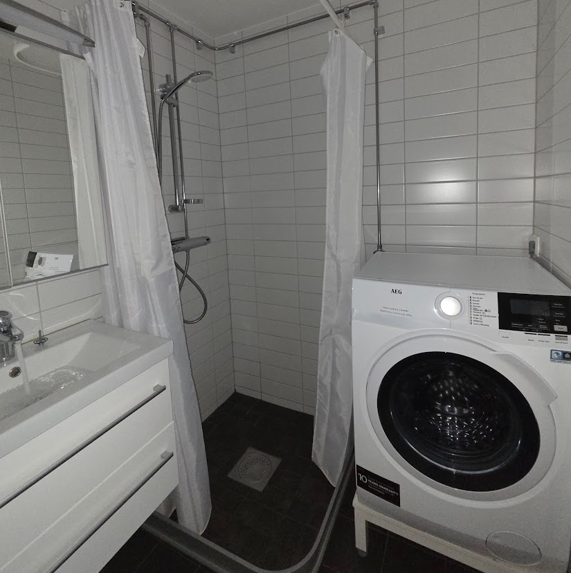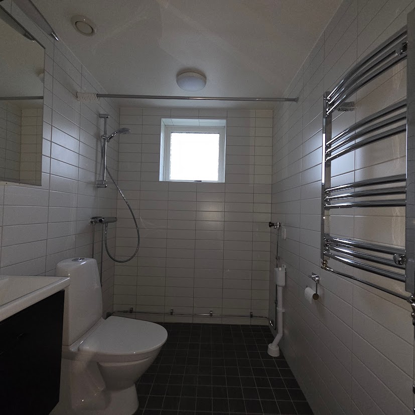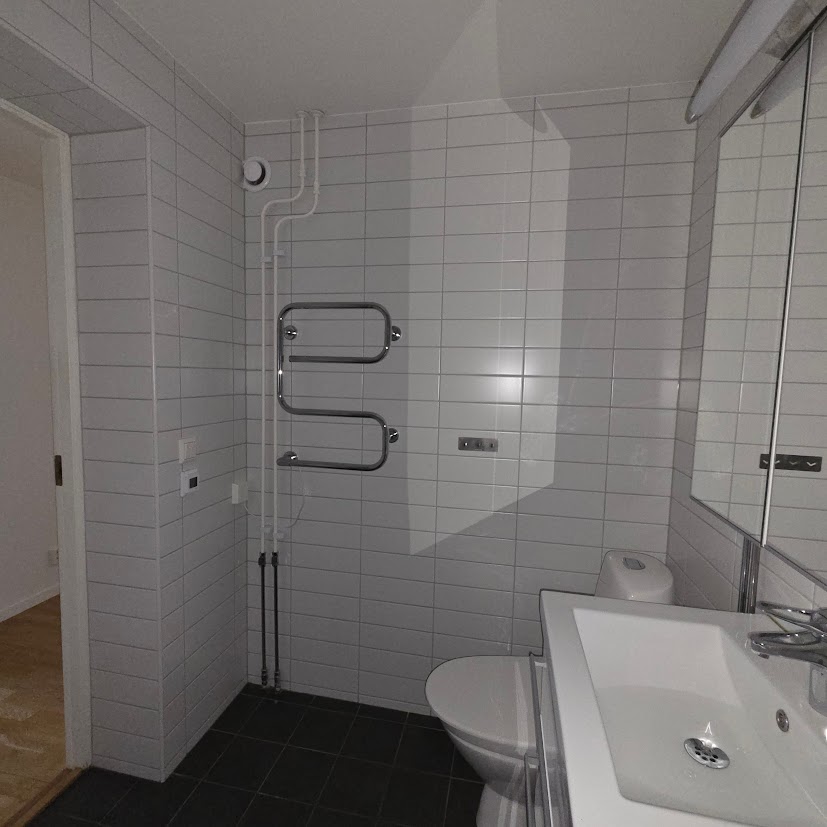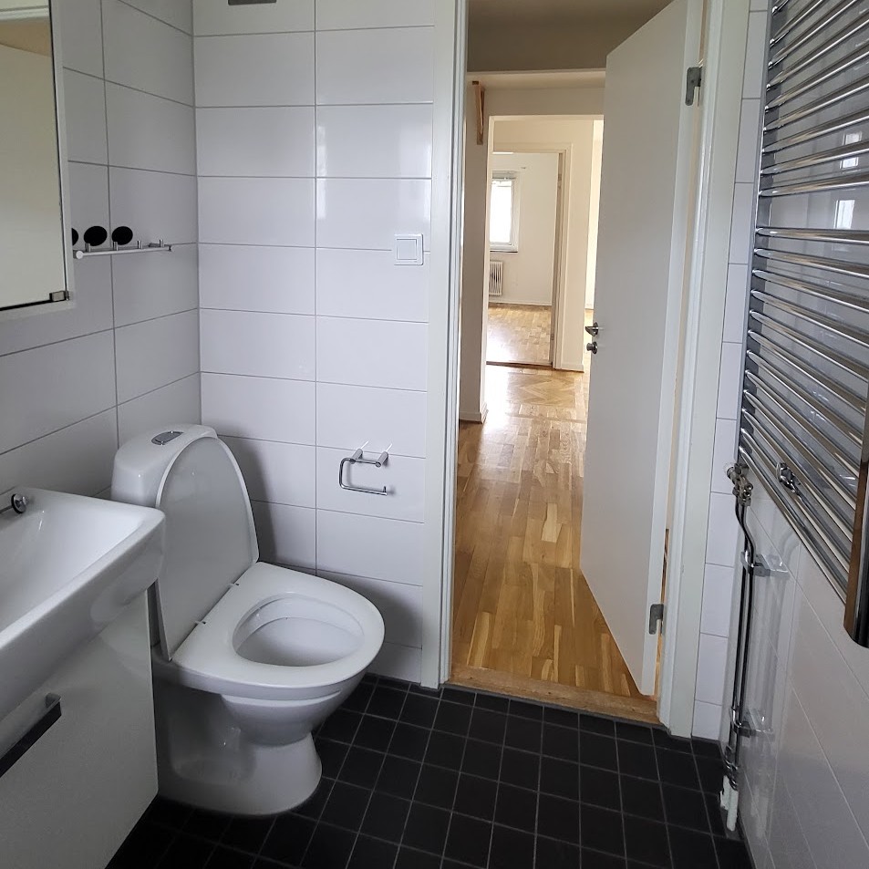 Nykaklat badrum med golvvärme och handdukstork. Förberett för tvätt/torkmaskin i badrum.